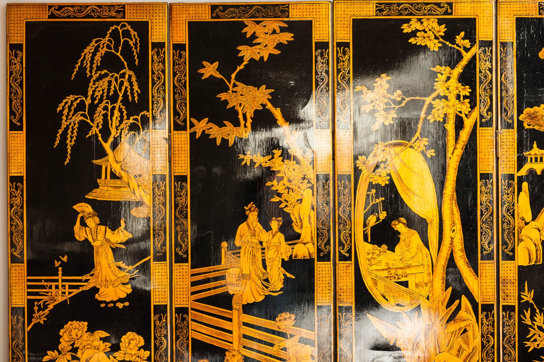 A glamorously elegant, hand-painted, Gold on Black, high-gloss lacquered 4-Panel room divider screen commissioned by us. Classical Japanese Garden theme on one side and a minimalist theme on the other side. Note that this screen is very heavy.
