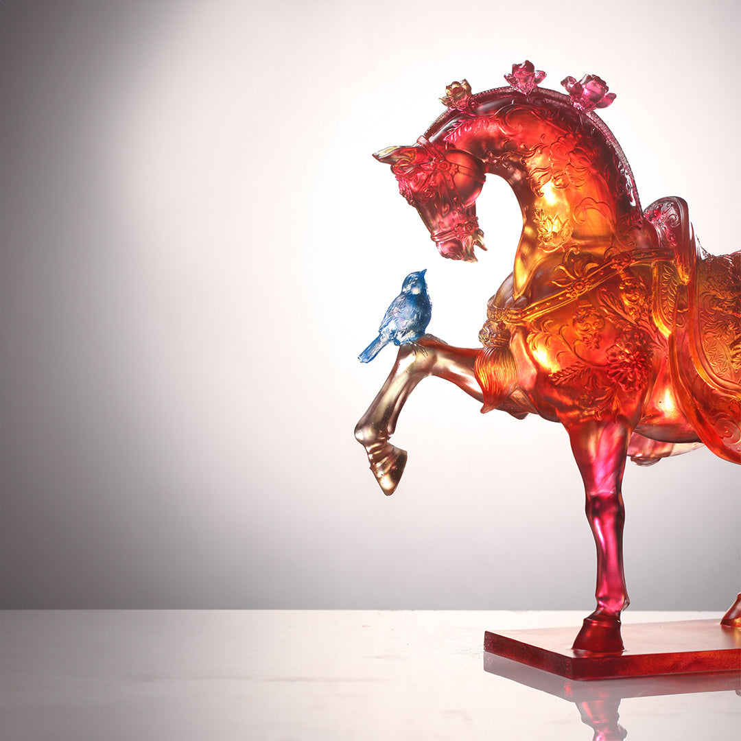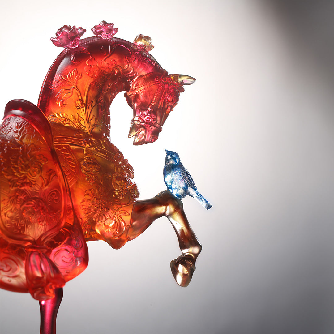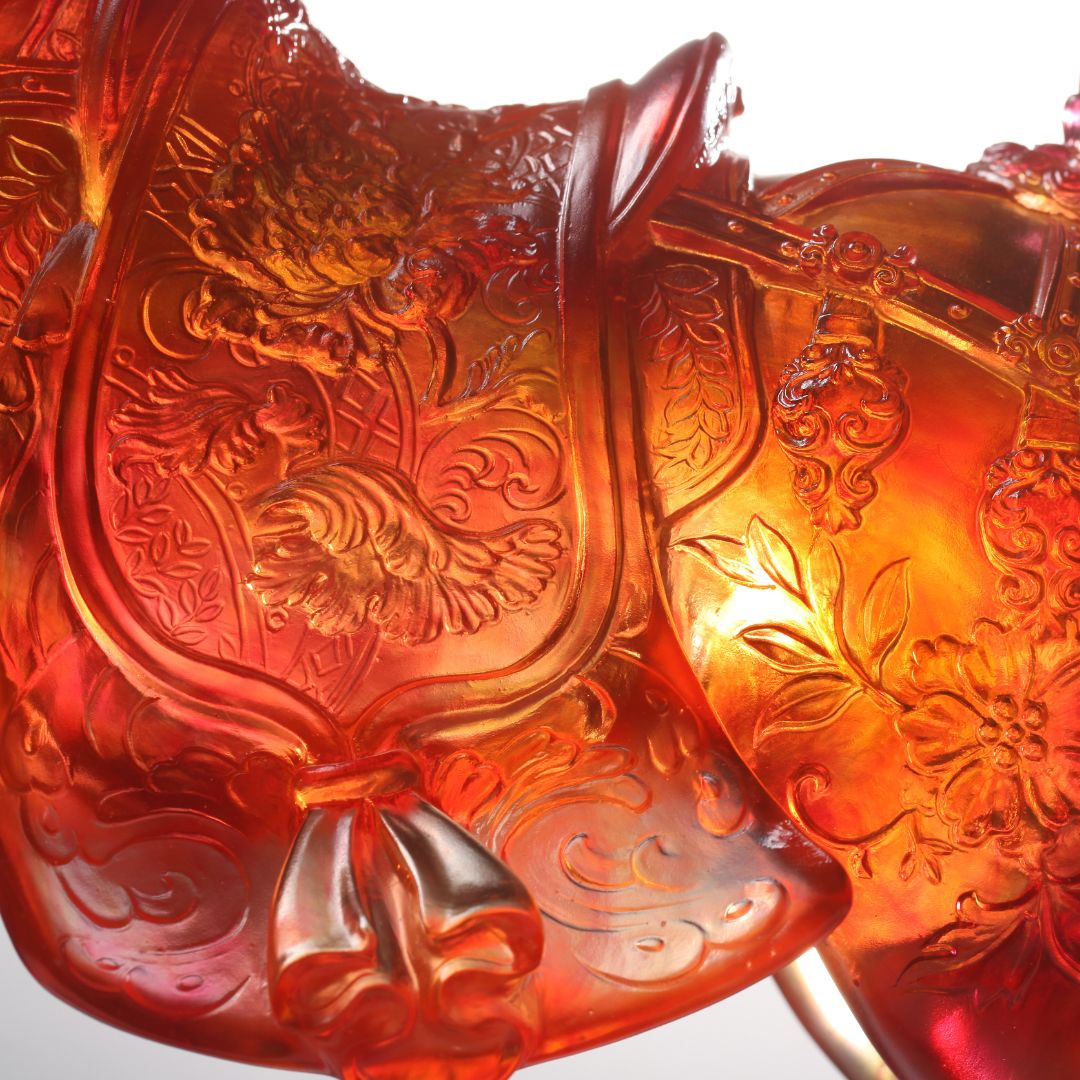 Technique: Crafted using the pâte de verre technique, the horse’s head and neck form a graceful, smooth arc that showcases craftsmanship’s attention to detail. This arc, resembling a crown, highlights the "three flowers" of strength and gentleness combined, adding a regal touch to the artwork.