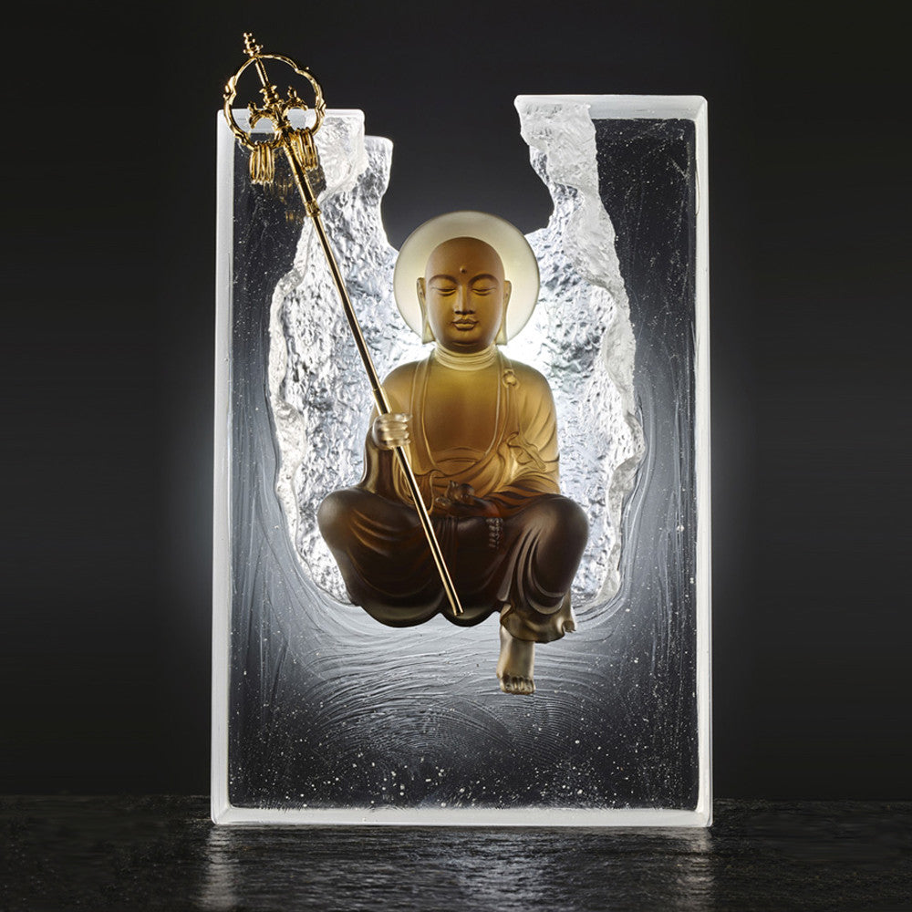 Ksitigarbha is one of the four main bodhisattvas in Chinese Buddhism, along with Guanyin, Manjusri, and Samantabhadra, and represents filial piety and the power of a vow. The Sutra of the Past Vows of Ksitigarbha Bodhisattva tells the story of how, over the course of successive lifetimes in the distant past, Ksitigarbha rescued his mother from hell, eventually making his famous vow, “Not until the hells are emptied will I become a buddha; not until all beings are saved will I attain enlightenment.” Ksitigarbha (Earth-store) embodies the strength of the earth and the prosperity brought about by the discovery of hidden treasure. Thus Ksitigarbha is described as “Peaceful and unstirred, like the great earth; entered into profound concentration, like a hidden treasure.” The roughly chiseled surface of this piece represents the turbulence of the world, aflame with the fires of the defilements, into which the bodhisattva calmly enters completely unscathed. The bubbles in the transparent glass represent the cooling effect of Ksitigarbha’s tranquil mind and lofty vow. In his hand is a pewter staff topped with metal rings, one of the 18 traditional requisites of a Buddhist monk in China. In contrast to the other bodhisattvas, Ksitigarbha is portrayed as a shaven-headed monk, due to his association with a prince from the Kingdom of Silla (57 BCE–935 CE, now South Korea) who became a monk, went to China, and practiced asceticism for 75 years before finally passing away at the age of 99 on Jiuhua Shan in Anhui province, the sacred mountain of Ksitigarbha and one of the four principle Buddhist sacred mountains in China. It’s widely believed that this monk was a manifestation of Ksitigarbha.