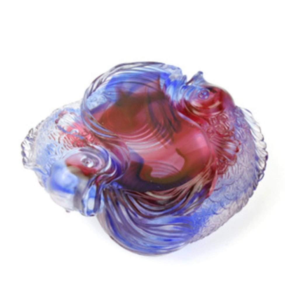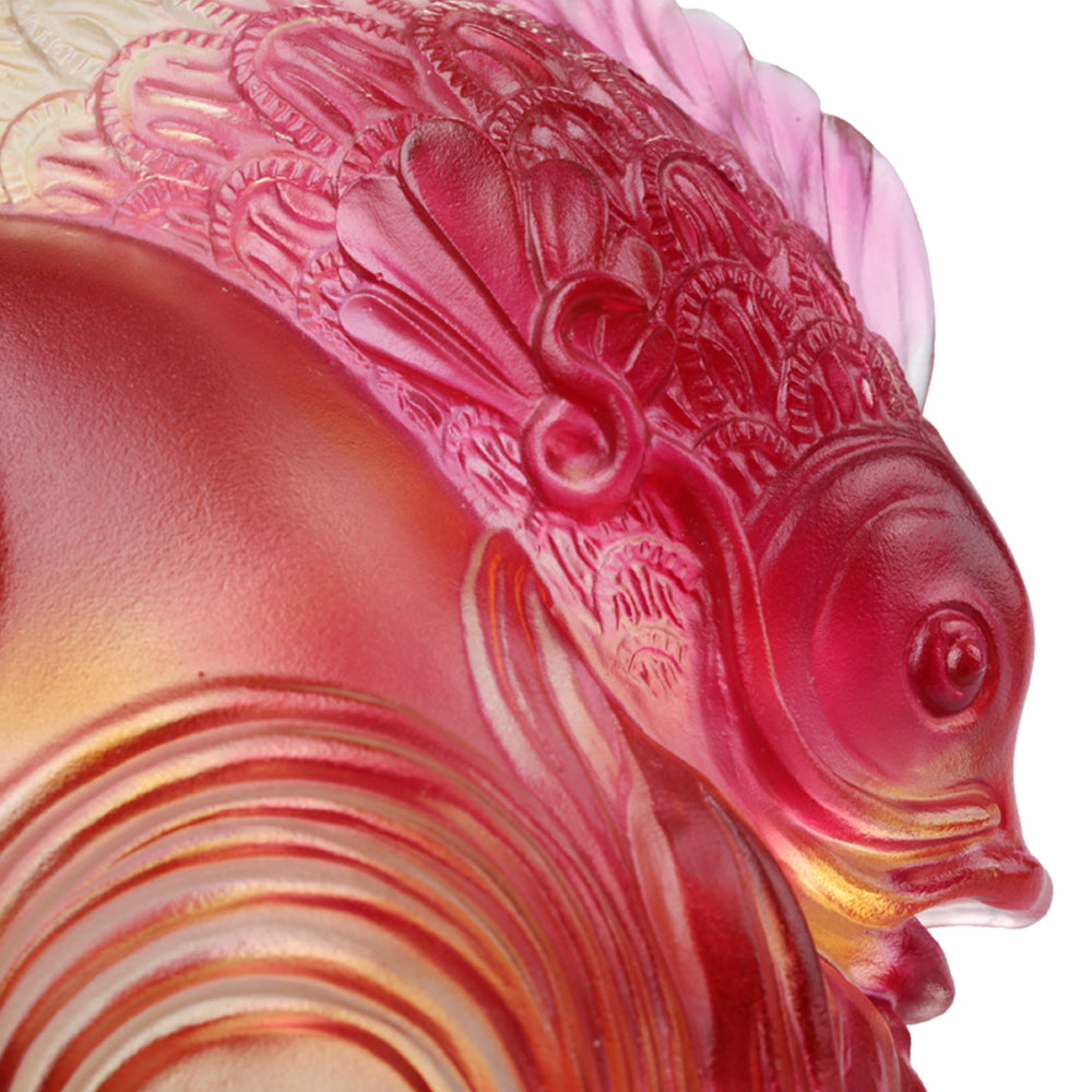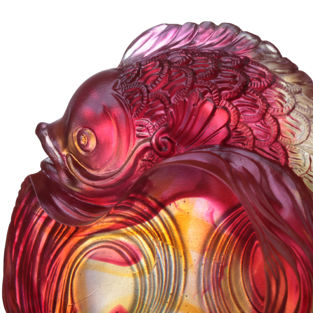This crystal glass paperweight artwork design comes from the expert craftsmanship and unique contemporary Chinese aesthetic of LIULI minds, balanced in a harmonious and ever-revolving yin-yang circle, and sculpted in great low-relief detail. The fish, a long-standing traditional symbol of prosperity and wealth, is combined here with powerful whirlpool-like spirals that represent an everlasting pattern of continuity and richness. 'Rows of Joy' is a glass art piece that suits any surface. Pair the warm reds and ambers with a wooden table or complement the warm bluish hues with earthy tones in a table runner.