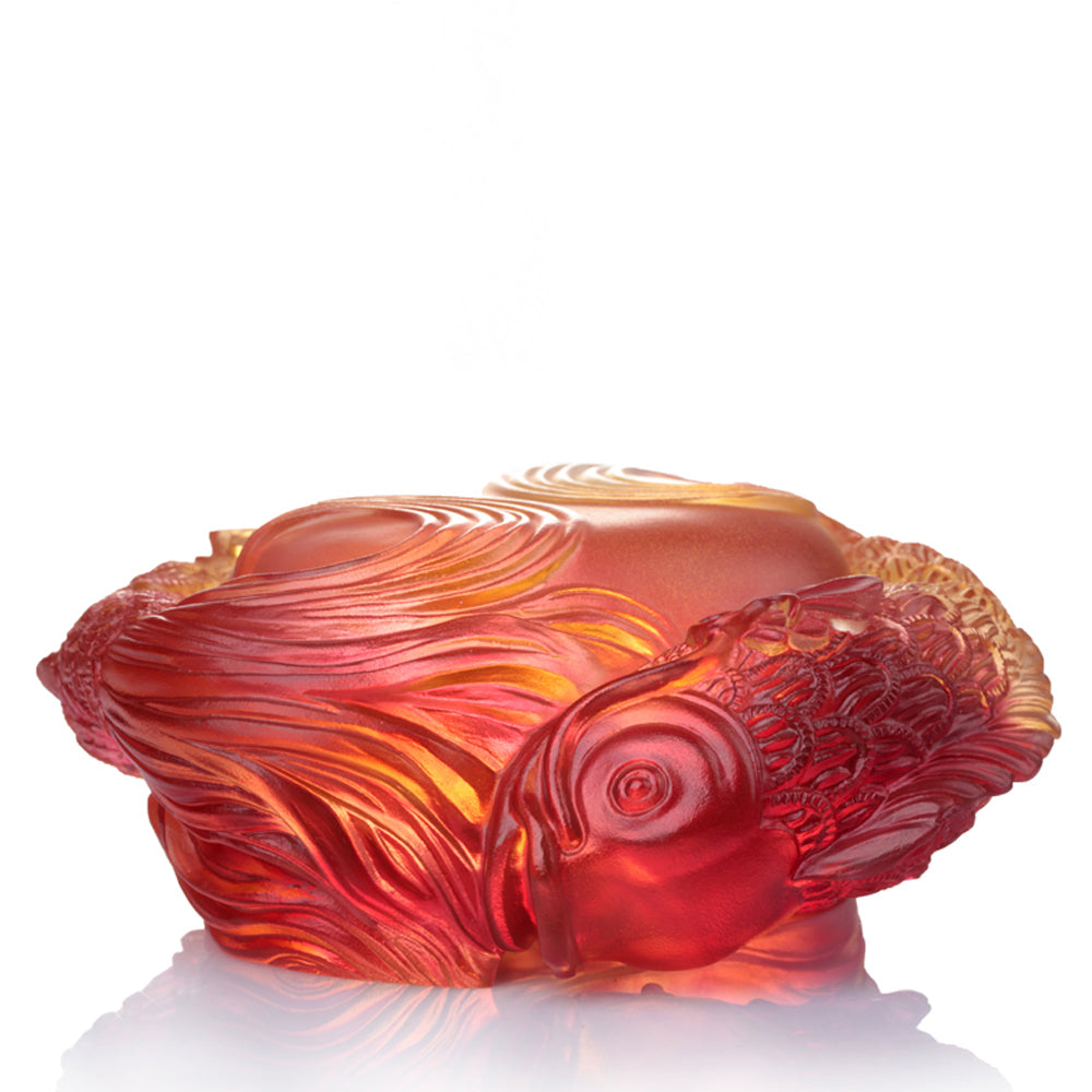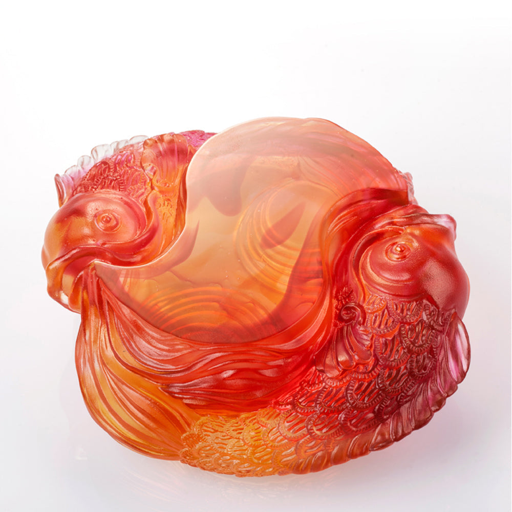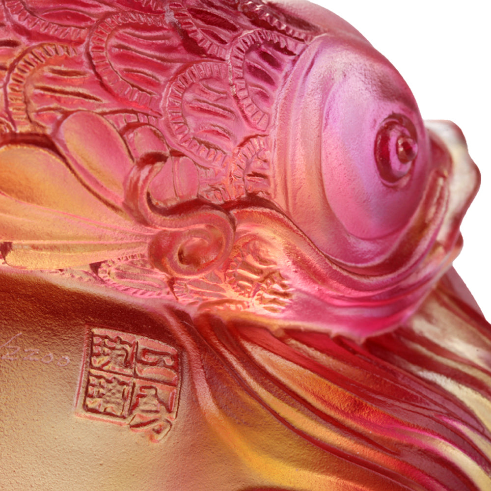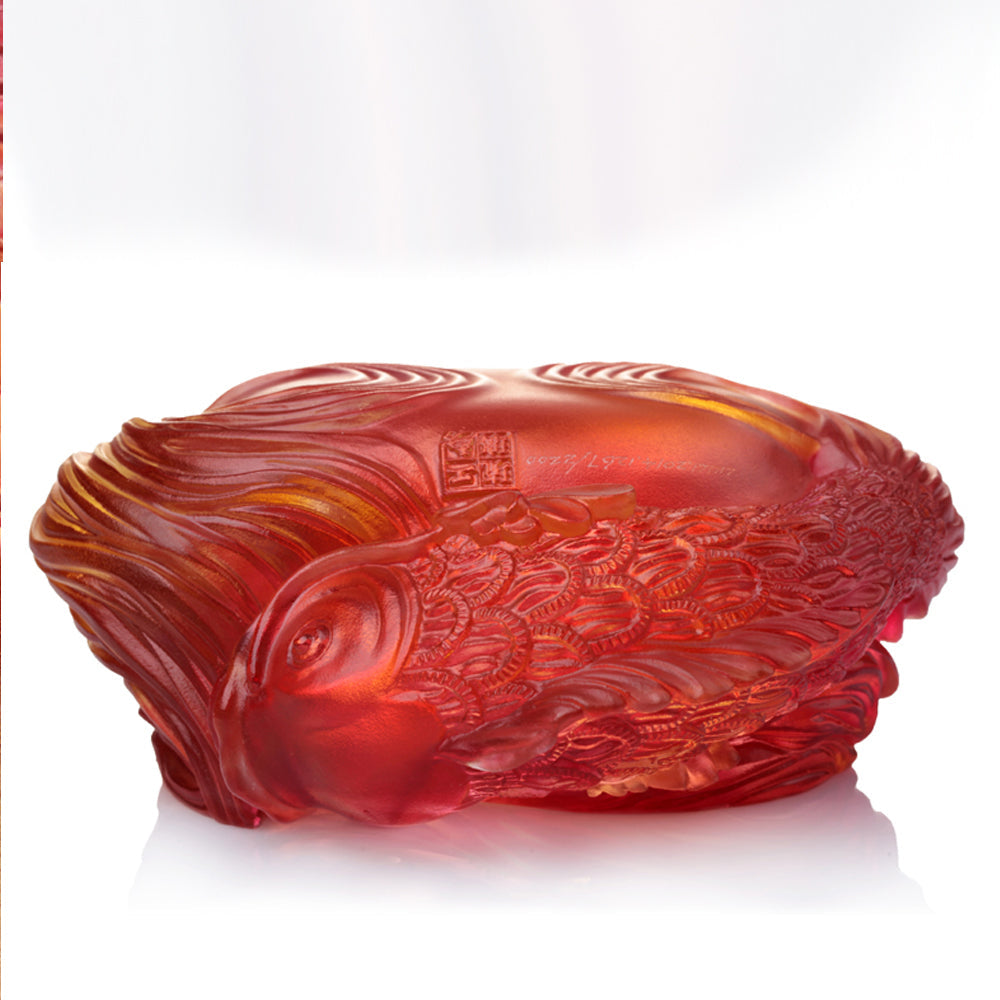 This crystal glass paperweight artwork design comes from the expert craftsmanship and unique contemporary Chinese aesthetic of LIULI minds, balanced in a harmonious and ever-revolving yin-yang circle, and sculpted in great low-relief detail. The fish, a long-standing traditional symbol of prosperity and wealth, is combined here with powerful whirlpool-like spirals that represent an everlasting pattern of continuity and richness. 'Rows of Joy' is a glass art piece that suits any surface. Pair the warm reds and ambers with a wooden table or complement the warm bluish hues with earthy tones in a table runner.
