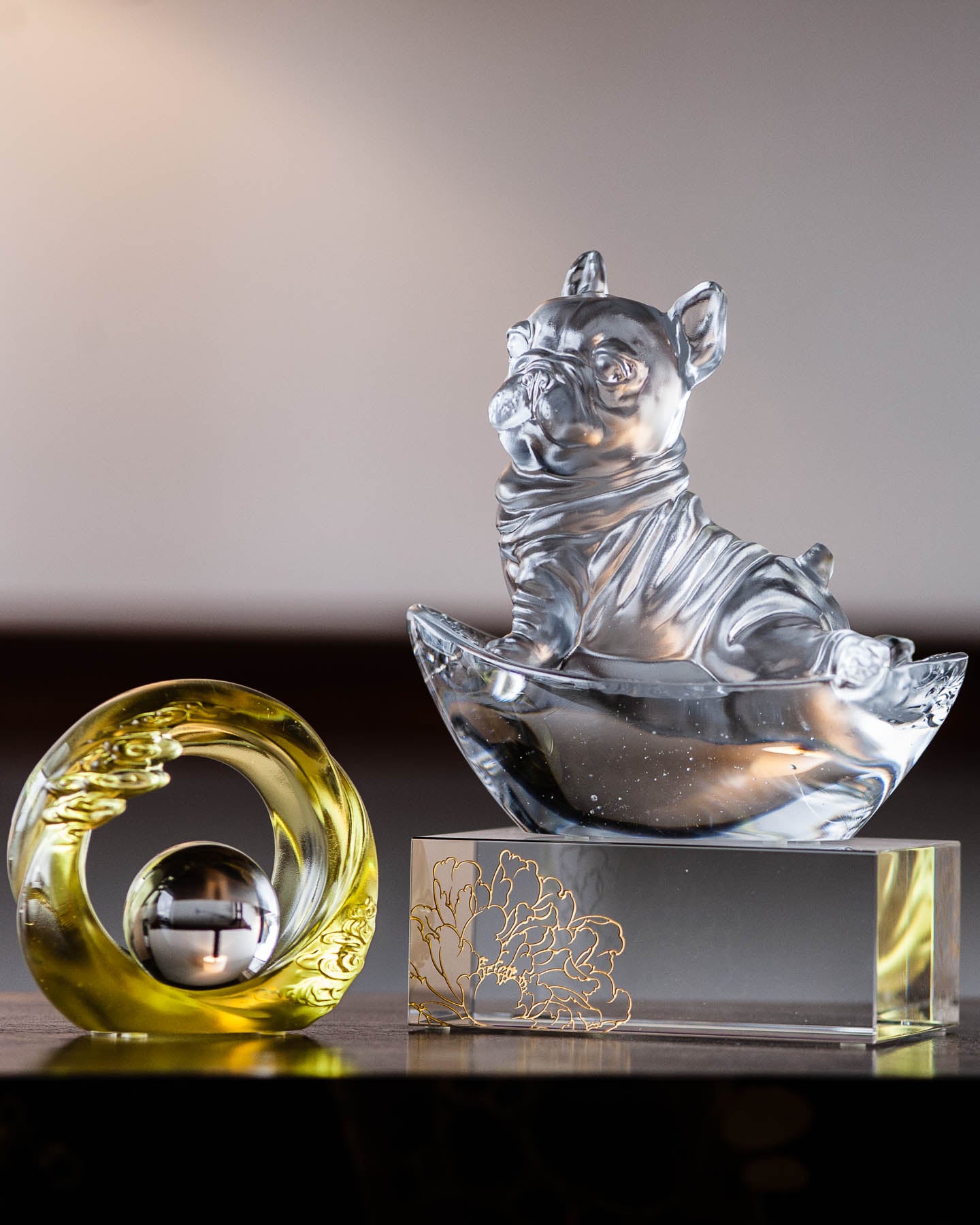 The Crystal French Bulldog, titled “Heads Up!”, is LIULI's first US-only design, limited to 100 pieces nationwide. It includes a customized crystal base with a peony flower in gilded gold foil lines.