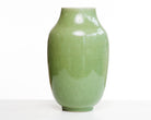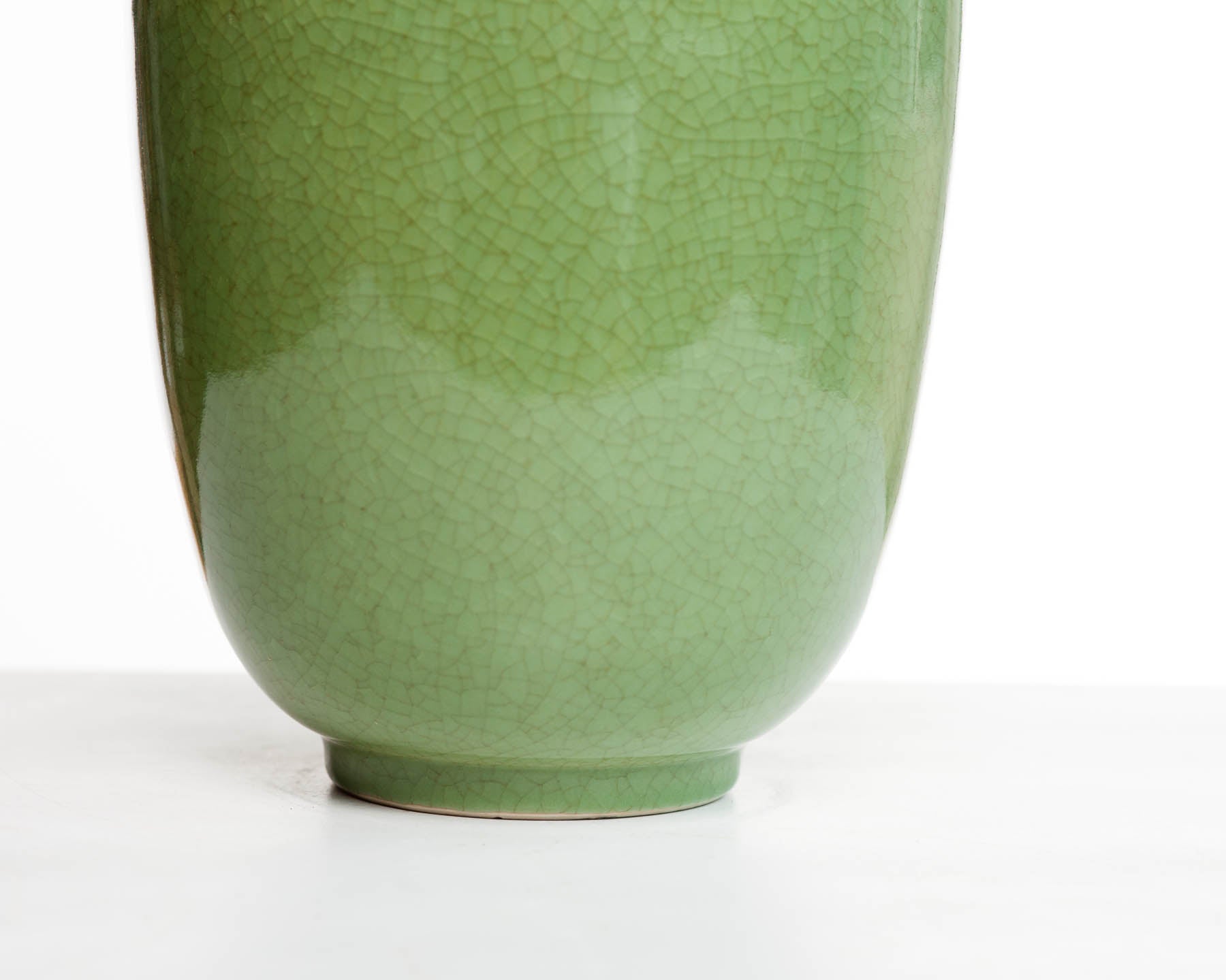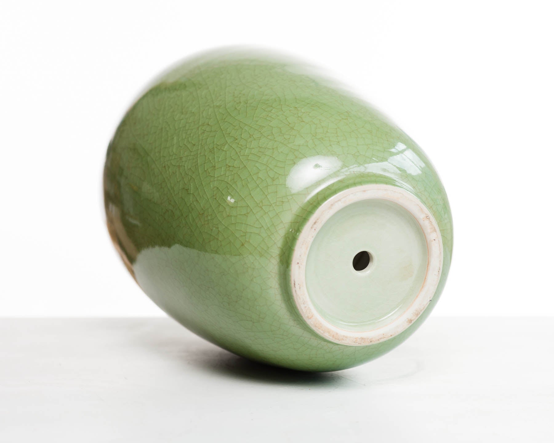 Large 14" Handspun (not cast) Lantern Shape Thick Porcelain Vase by Master Hsu Chiao-Tsung in celadon green crackle glaze. Master Hsu is a Presidential award winning ceramicist in Taiwan. These vessels were made exclusively for us at Lawrence & Scott for lamp making.