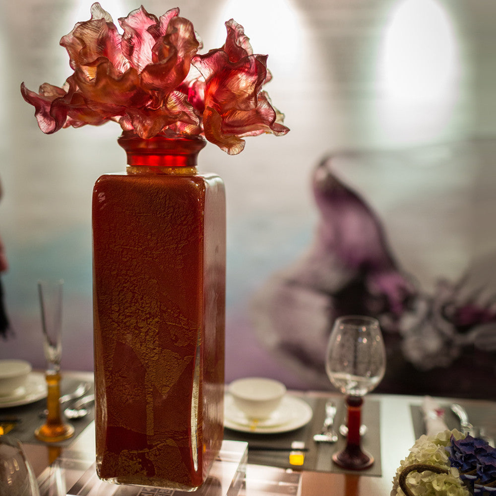 The parrot tulip, sometimes known as “foreign lotus,” originated from Europe and Central Asia. Crafted into a tall, upright treasure vase with the vivid contrast of glimmering gold leaf, the tulip’s true beauty is revealed here. A closer look reveals a bevy of goldfish gathered over the mouth of the bao ping (or treasure vase) their tails blossoming grandly into the many rich colors of the parrot tulip. After months of trial and error, LIULI artists are capable of casting such designs, achieving excellent balance, in tandem with special mouth-blowing techniques. Symbolizing royalty, transcendence, and wealth, “In Praise of the Tulip” is a one-of-a-kind art piece with roots in traditionalism and contemporary design.