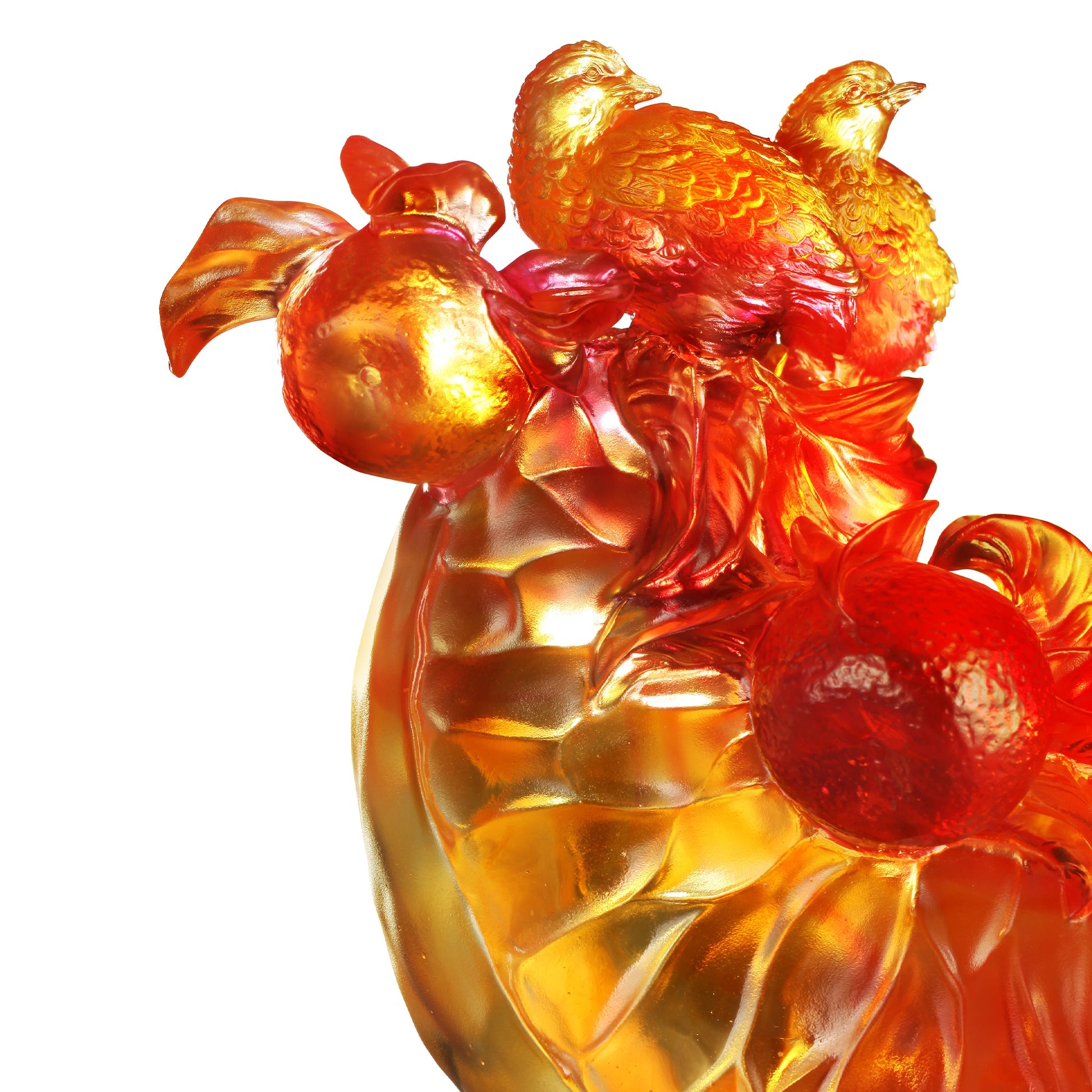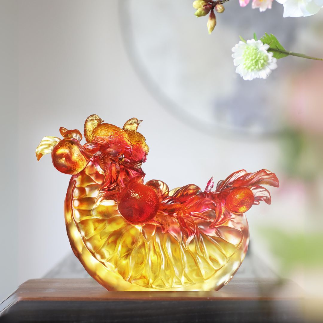 Design Concept: In this artwork, two quails stand on a branch, one tilting slightly to the right with the other at a higher position, their gazes aligned. Quail symbolizes peace and wellness in Eastern culture. The orange symbolizes good luck with six of them circling the quails' feet, conveying people's aspirations at joyous occasions. The piece depicts a mother's love and sacrifice, with the oranges representing a rich and fulfilling life, portrayed through realistic art. The base of the artwork displays a natural and plump orange petal, crafted with attention to detail, with a unique and beautiful ripple-like pattern. The overall design of the piece is uplifting, resembling a treasure ship carrying two hearts filled with blessings, sailing smoothly through the river of time. |