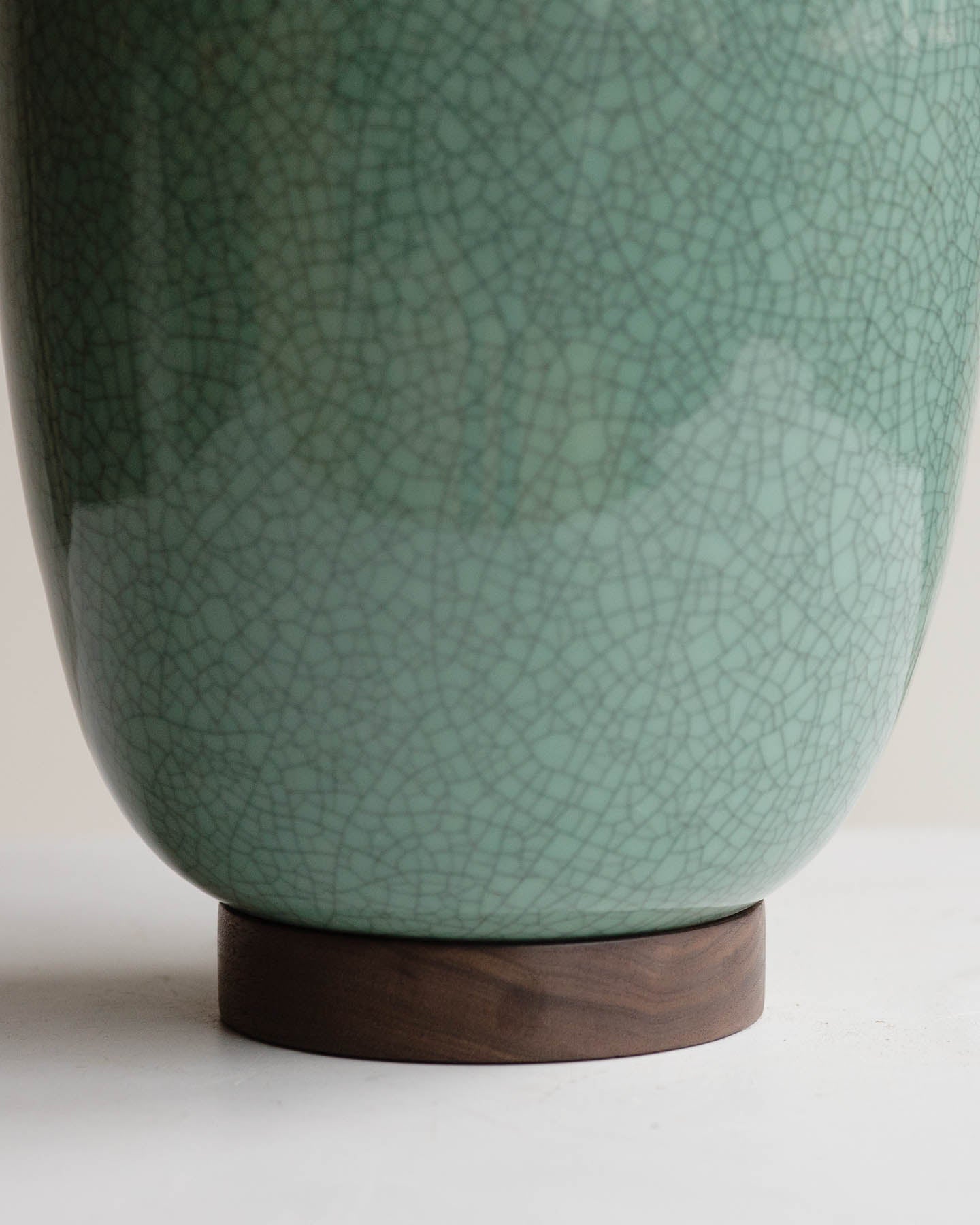 Exquisite craftsmanship is at the heart of this lamp, as the Lagom porcelain lamp vessel was meticulously fashioned in Taiwan by the esteemed Presidential award winner, Chao-Tsung Hsu, exclusively for Lawrence & Scott. The lamp's allure is further enhanced by the addition of a hand-turned FSC-certified walnut cap and stand, exemplifying our unwavering commitment to both exquisite aesthetics and sustainability.