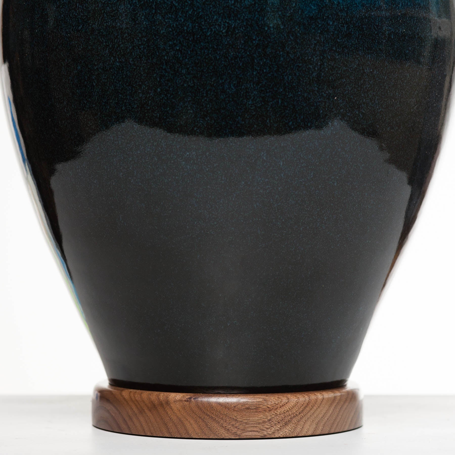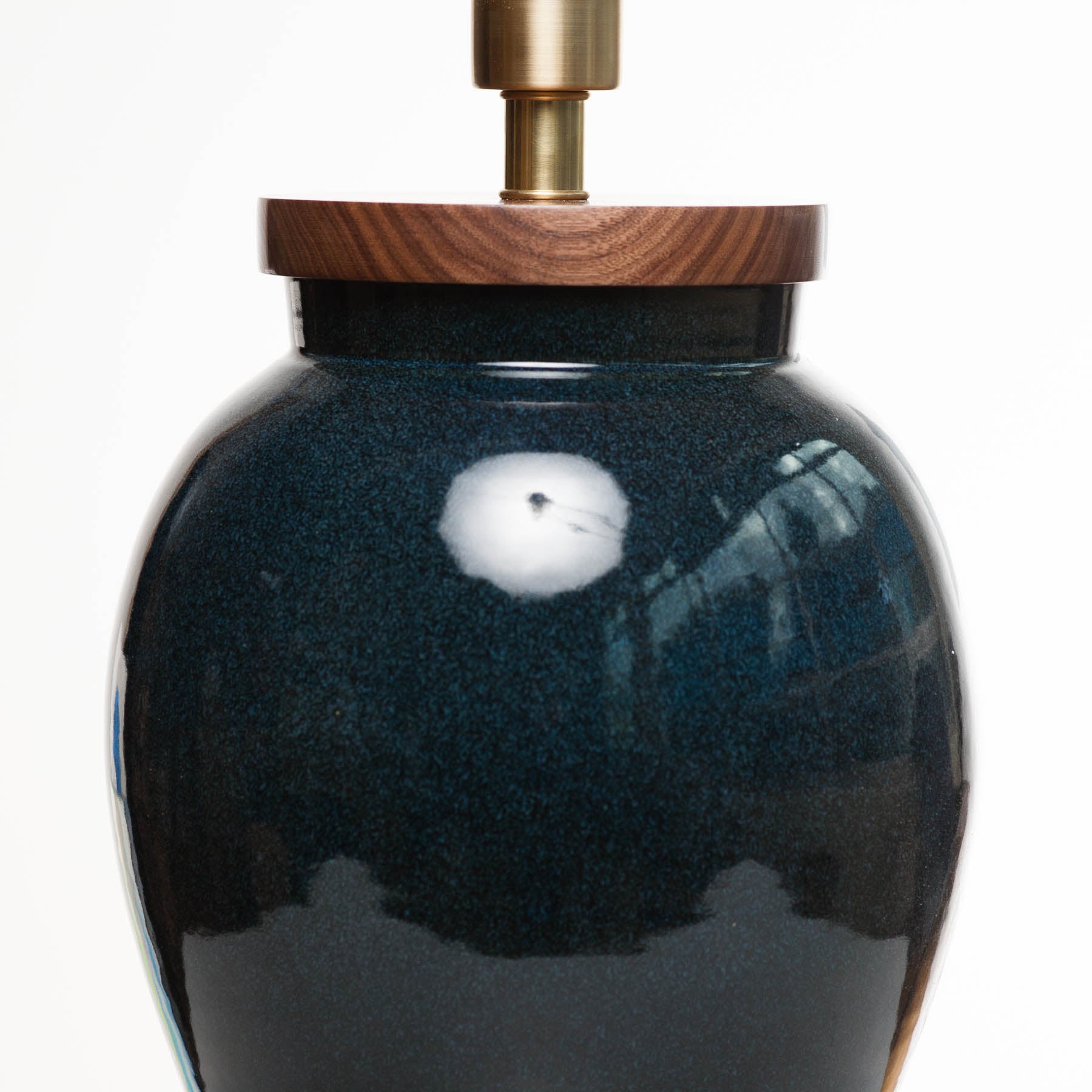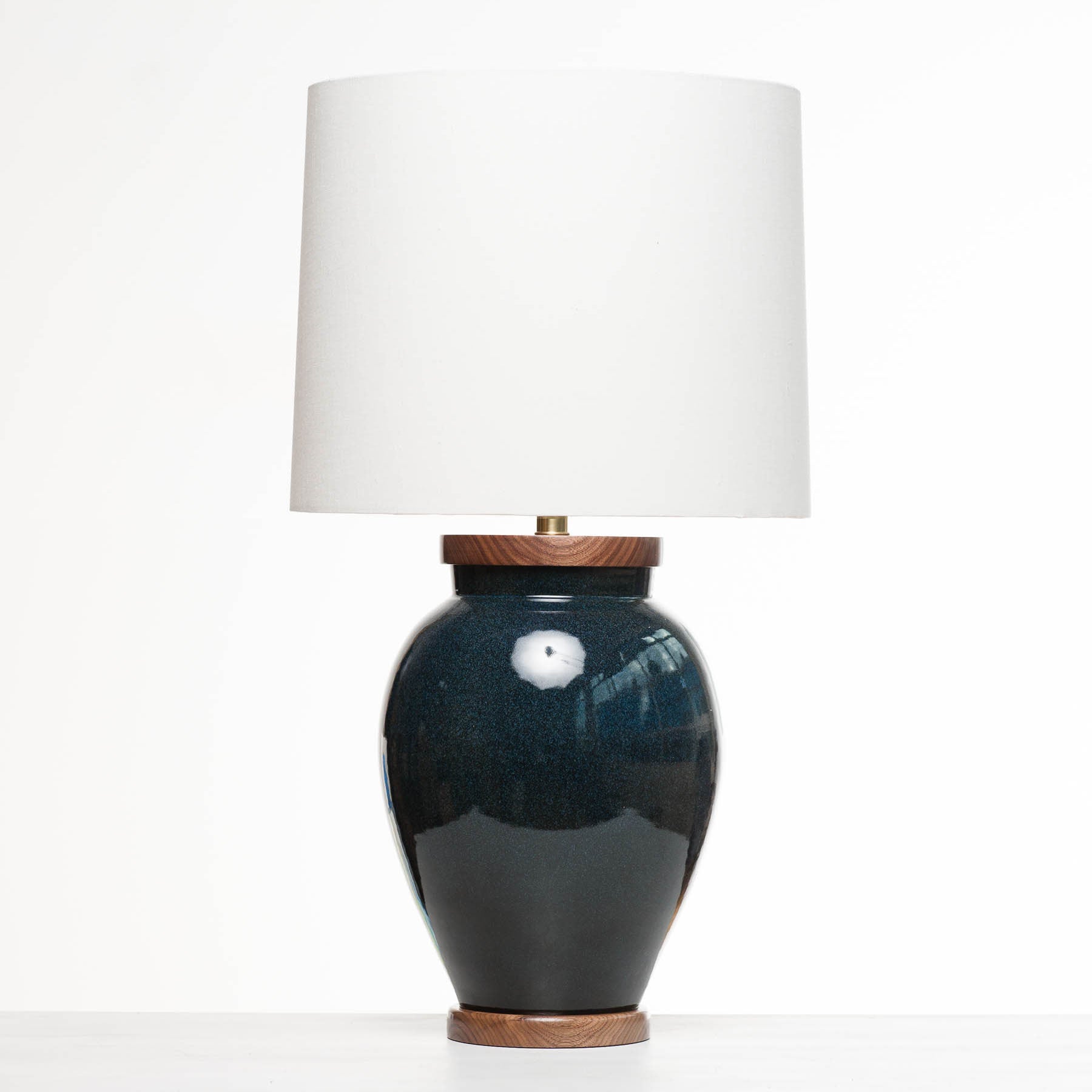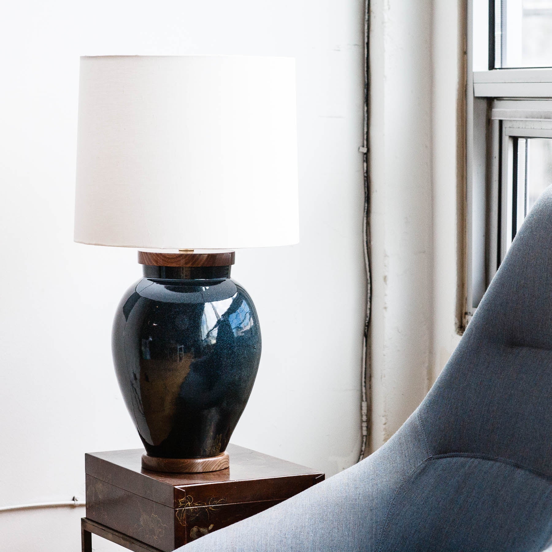 The porcelain vessel was hand spun in Taiwan by Presidential award winner Chao-Tsung Hsu exclusively for us at Lawrence & Scott, and we finished this piece with hand-turned sustainably harvested walnut cap and stand. Our made-in-house textured white linen shade comes standard, and we are ready to customize it further for your specific space.