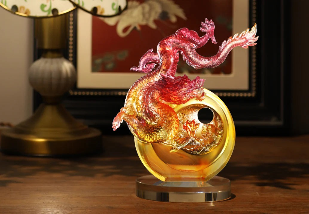 When celebrating joyous occasions, people dance with dragons and play with pearls, and their visions shimmer with the light of dragon lanterns, connecting the beautiful hopes of the past, present, and future. With the "Ambition to Soar," one sets lofty goals, always looking forward with ambition. Using overlapping circles to represent the sky, the universe, and the eternal belief that persists throughout it provides unending vitality in the days and months that pass.
