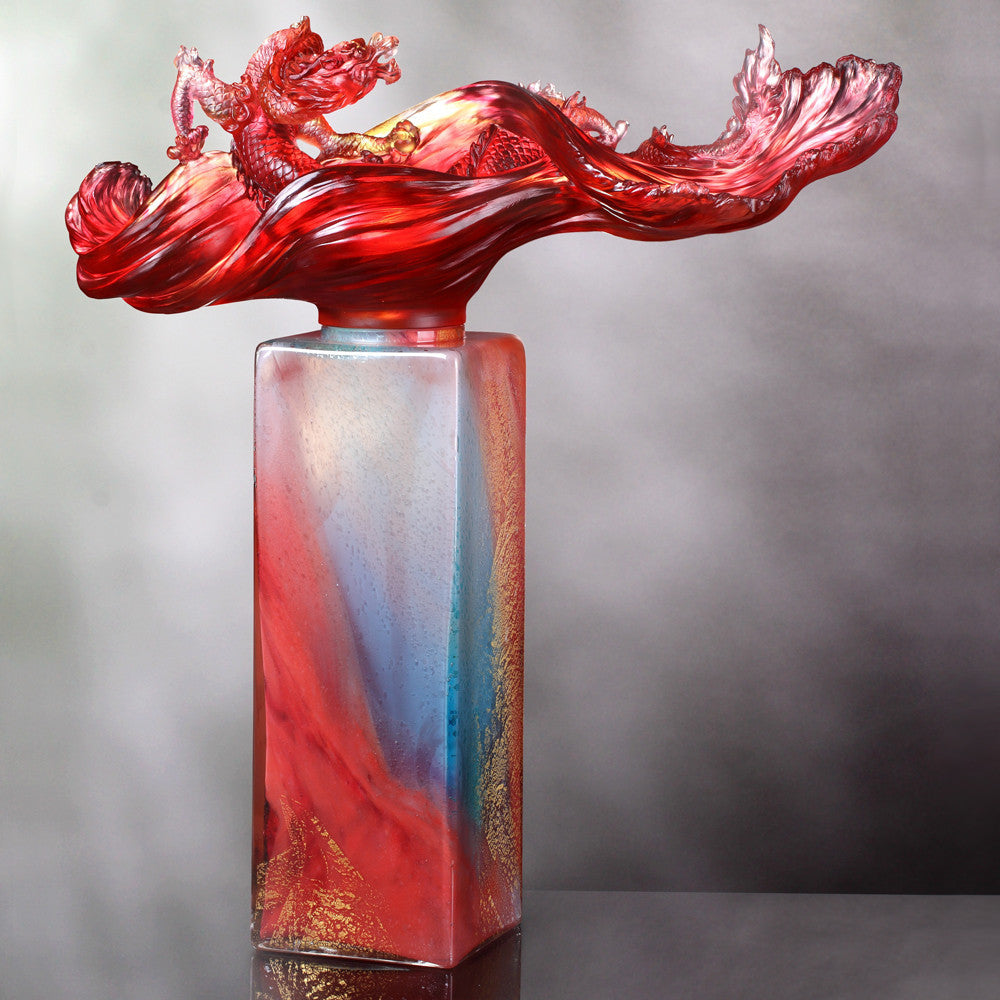 Perhaps the most exquisitely balanced piece of the collection is the “Dragon Rising Baoping” (treasure vase). With arduously achieved asymmetry and a gorgeous flowing movement, this crystal glass artwork perfectly exemplifies the “water element” dragon it depicts. Like the tide ebbing and flowing or the river coursing and resting, the piece’s dynamic dragon moves in and out of the design, emerging righteously. LIULI artists decorate the uniquely shaped mouth-blown crystal vase using sheets with glimmering patterns of gold leaf. Being the first of its kind anywhere, no other artwork in the world took the same kind of technical prowess as this collection. Rooted in deep tradition and cultural symbolism, this contemporary piece is benevolent, kind, ascending, and powerful all at once.