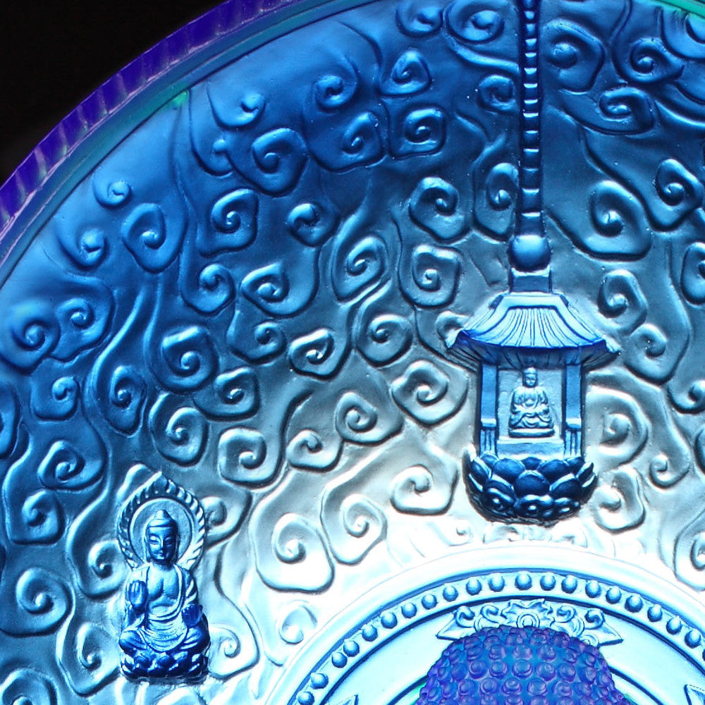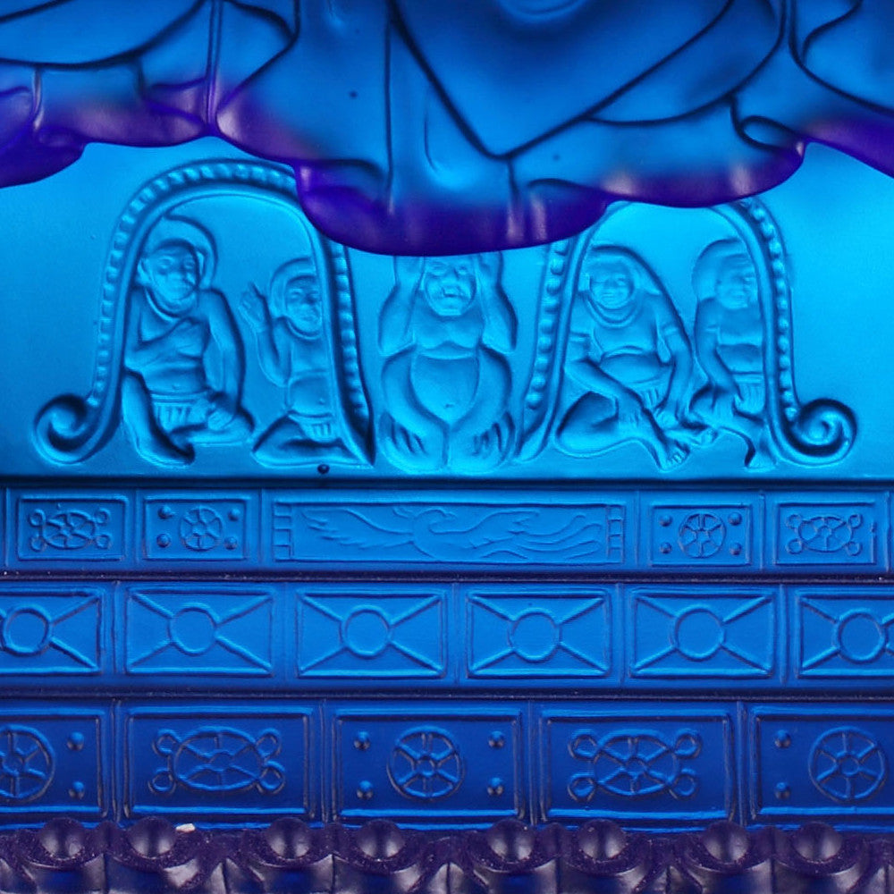 Bhaisajyaguru, commonly referred to as Medicine Buddha, presides over the pure land Vaiduryanirbhasa (Lapis Lazuli Radiance), located in the east. In accordance with the description of Medicine Buddha’s dharma-body found in the scriptures, this image is cast in azure blue, the color of the sky, representing an ever-present guiding light. Amongst the twelve vows Medicine Buddha made while still a bodhisattva, the second begins, “I vow that in a future life, upon attaining enlightenment, my body will be like lapis lazuli, bright and limpid inside and out.” This vow has been Loretta H. Yang’s guiding inspiration in producing glass sculptures over several decades.