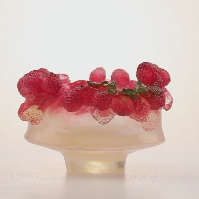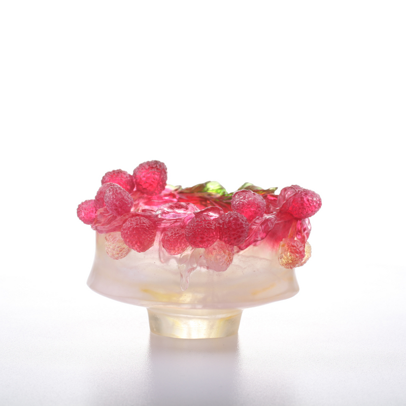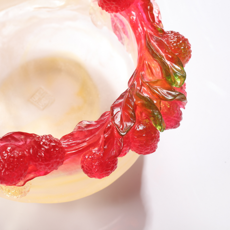 This artwork is designed for pomegranates, which are regarded by the Chinese as auspicious symbols representing family prosperity and the blessing of many children. The surface of the Liuli retains carved textures while presenting varying shades of yellow-green flow patterns, symbolizing a moment of Qi Baishi's brush dancing with ink. The three modestly shaped pomegranates are stacked and twisted, initially appearing somewhat peculiar yet intriguing. However, upon closer inspection, their abundant talent is revealed, adding to their charm. The holder can elegantly store writing utensils or engage in spontaneous flower arranging. Placed on a desk or by a bright window, when sunlight filters through, the crystal-clear fruits of the pomegranate in the upper left corner radiate, imbuing the living space with an endless atmosphere of joy.