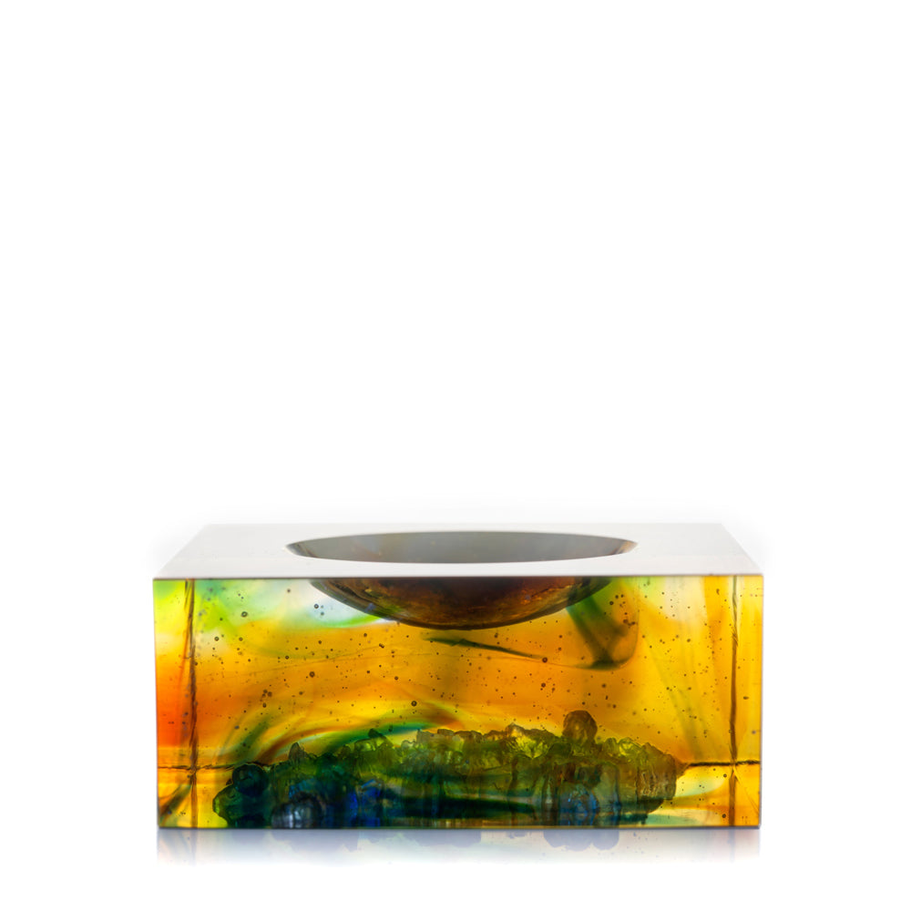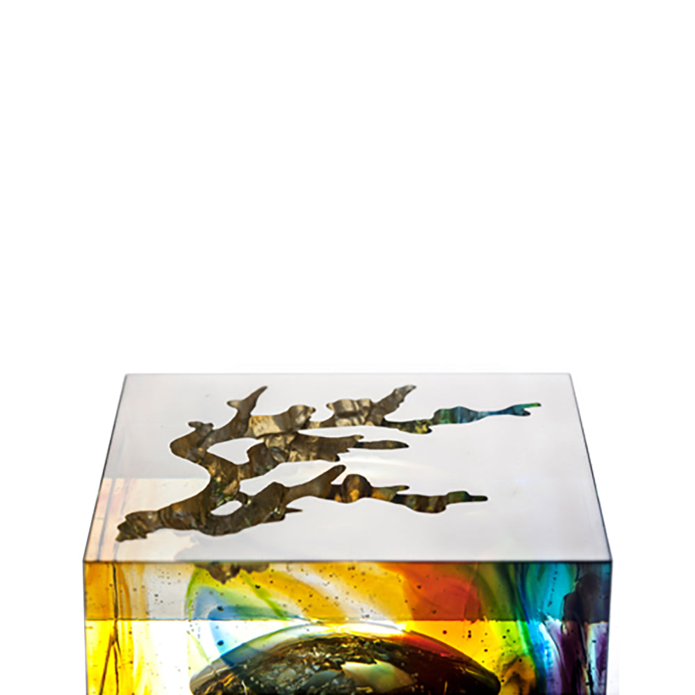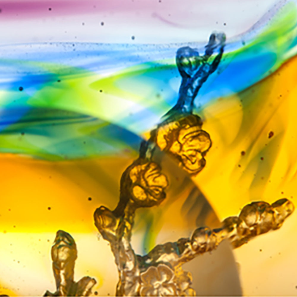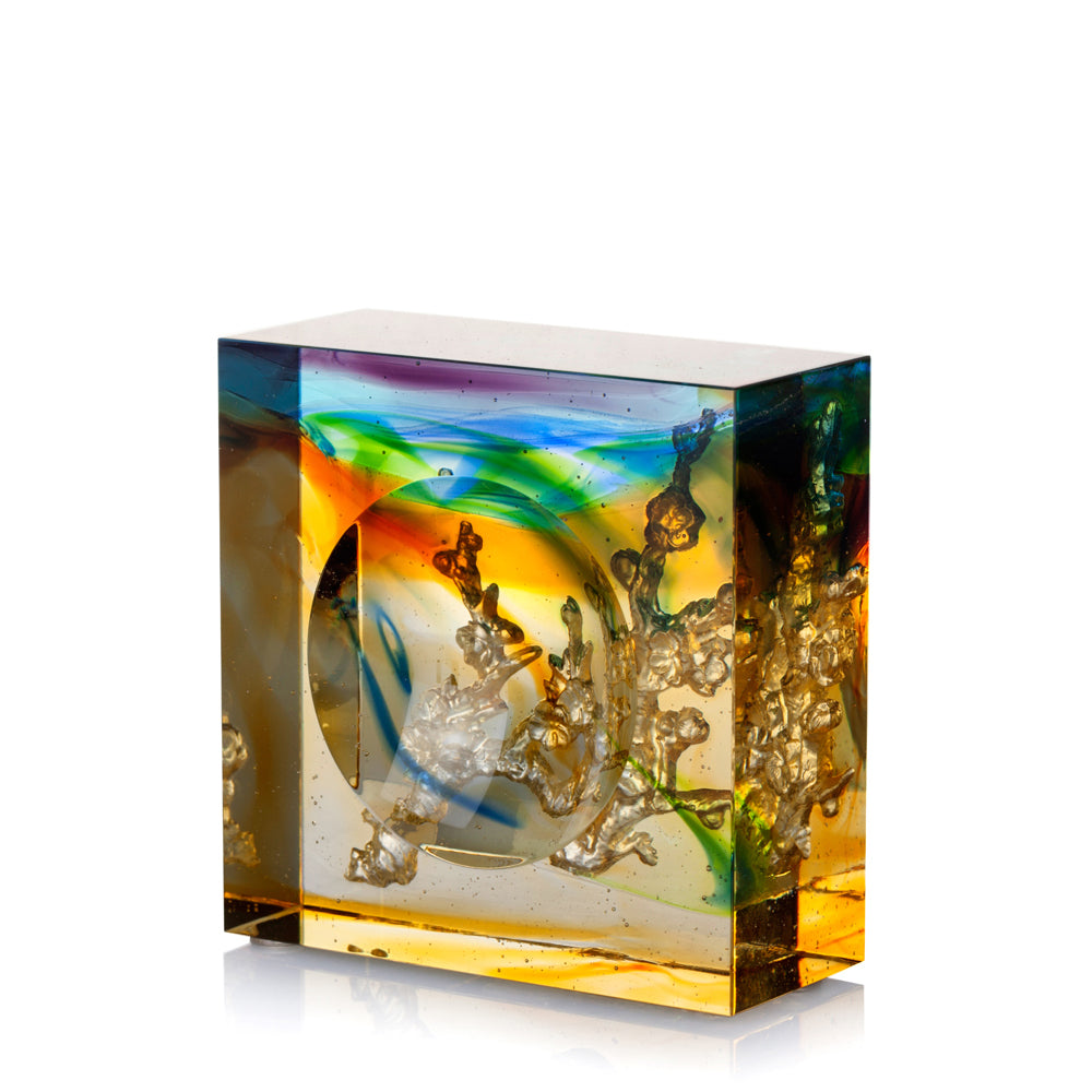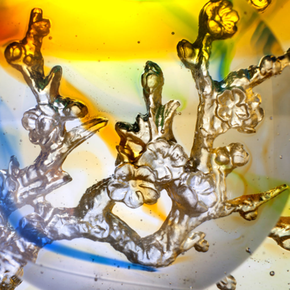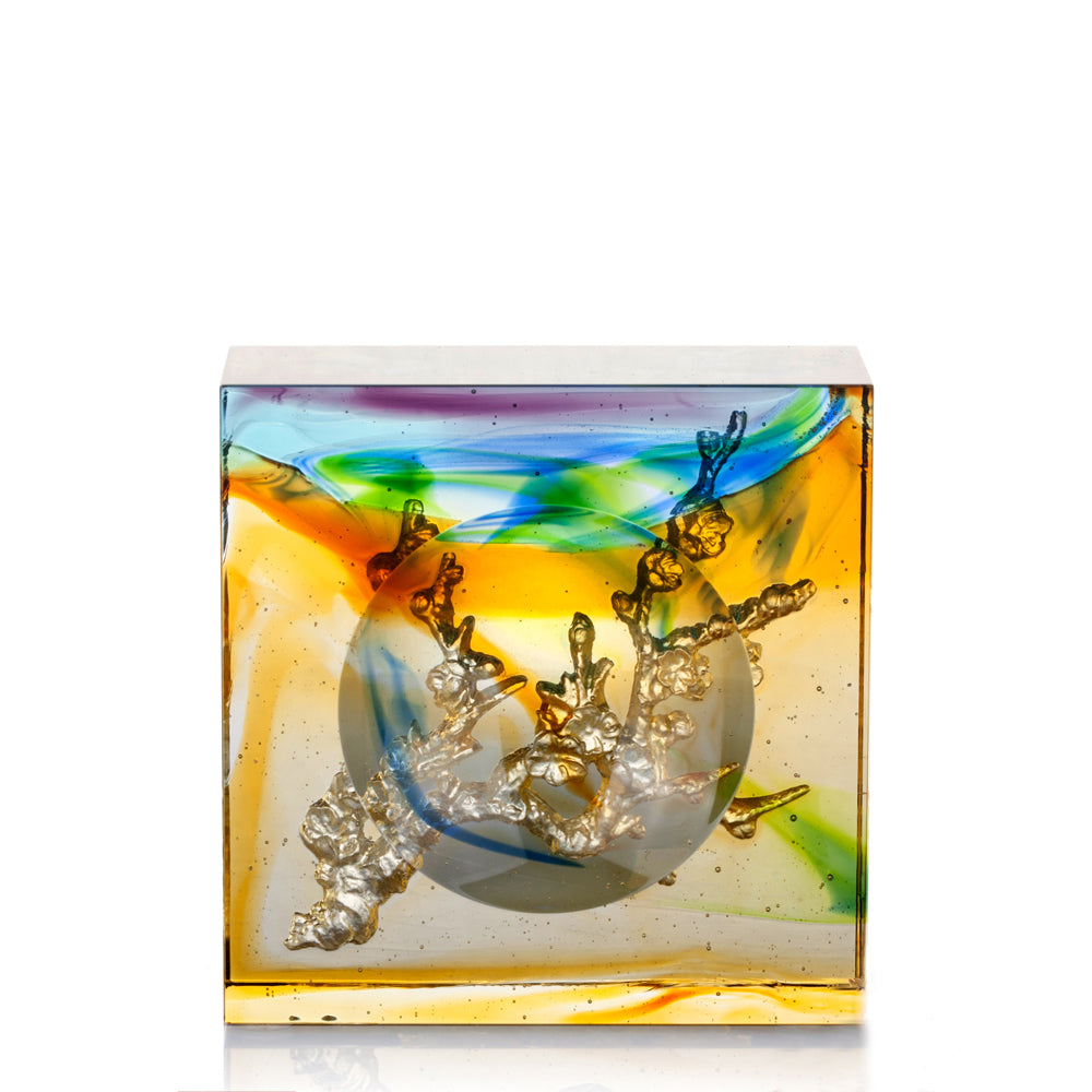 This decorative object has a dazzling contrasts between its radiant colors and juxtaposed shapes. Drawing on timeless motifs of full moon and plum blossom found in Far Eastern cultures, it features a tranquil moment of inner peace and fulfillment. This could also be used as a paper weight, or a decorative object on the tabletop.