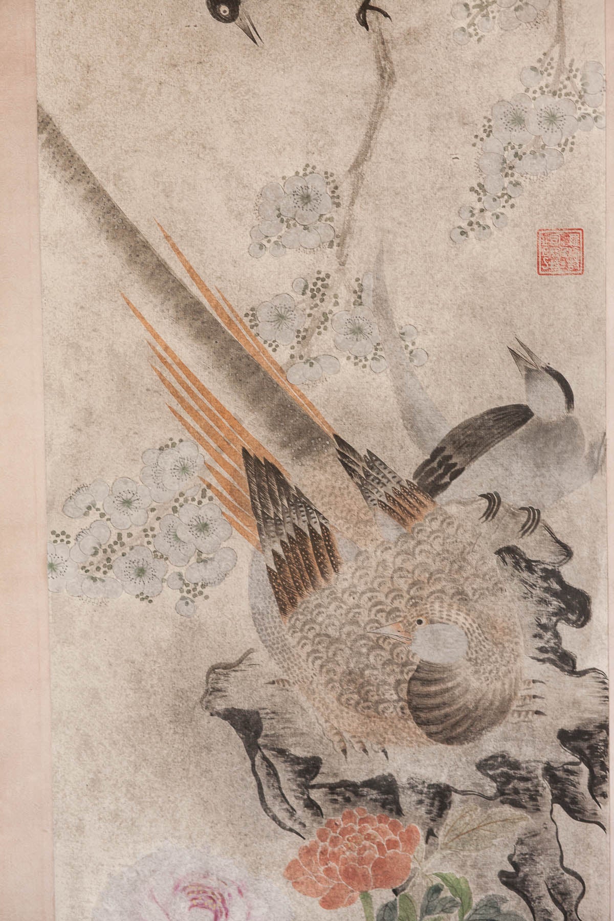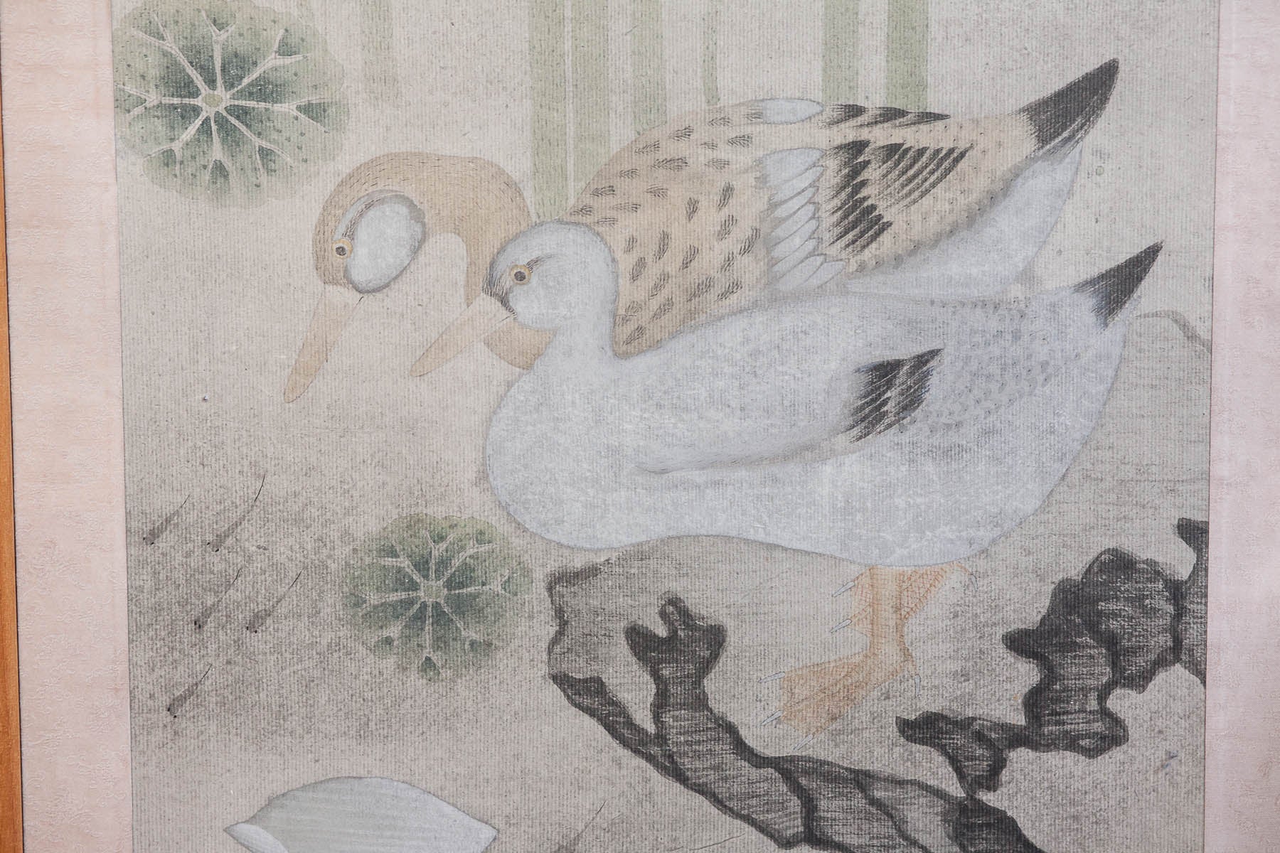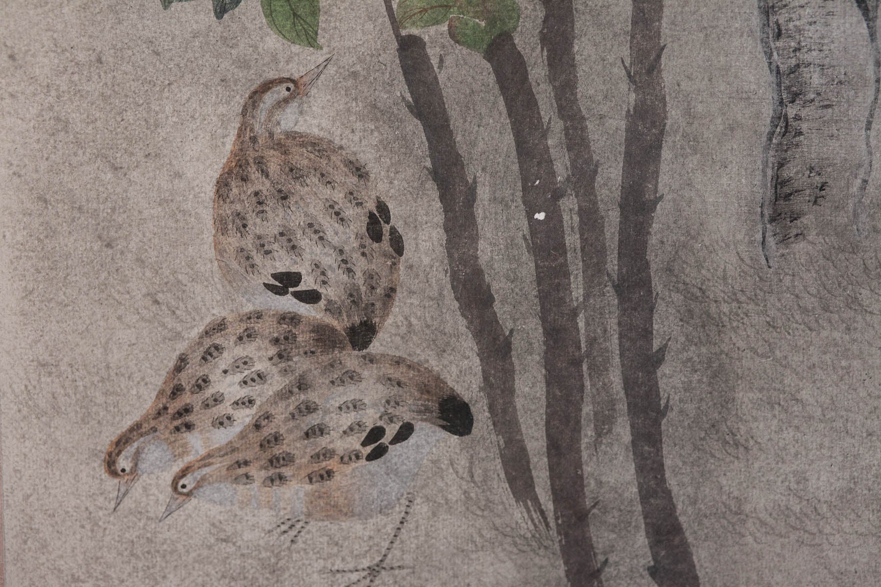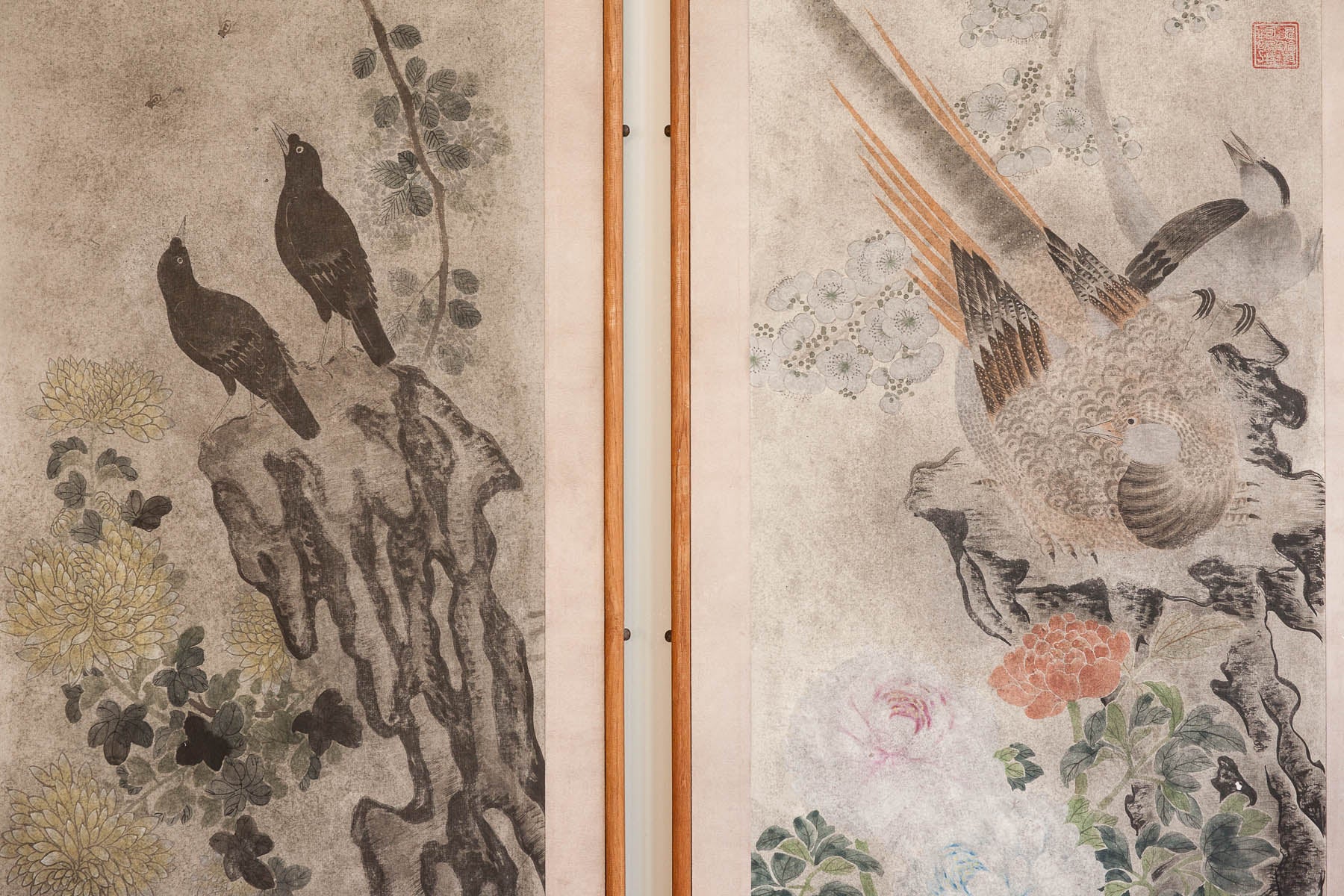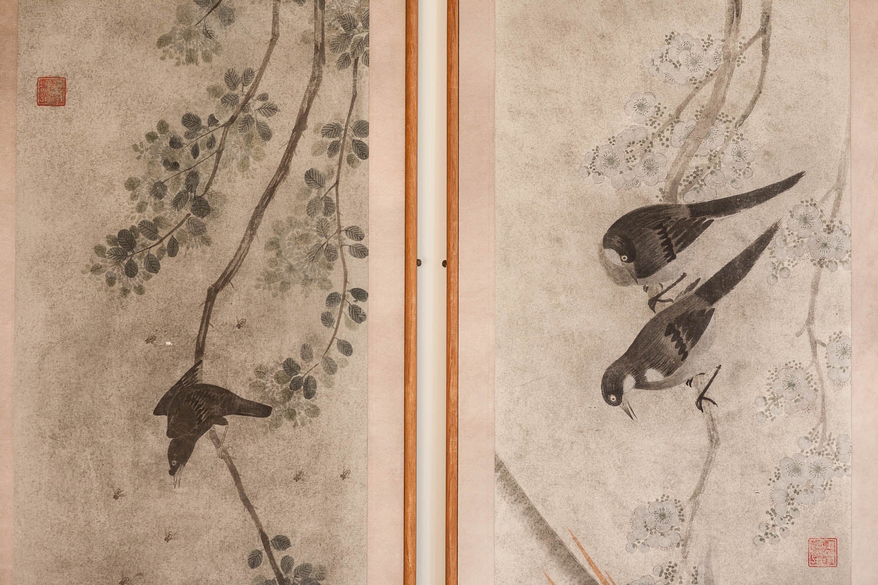 Using traditional Chinese ink brush technique, each screen shows a dynamic, joyful and detailed scene of the season. Individually wood-framed, with protective brass studs, ready for wall mounting with standard panel mounting hardware. Panels can be freely mounted to suit the design of the space.