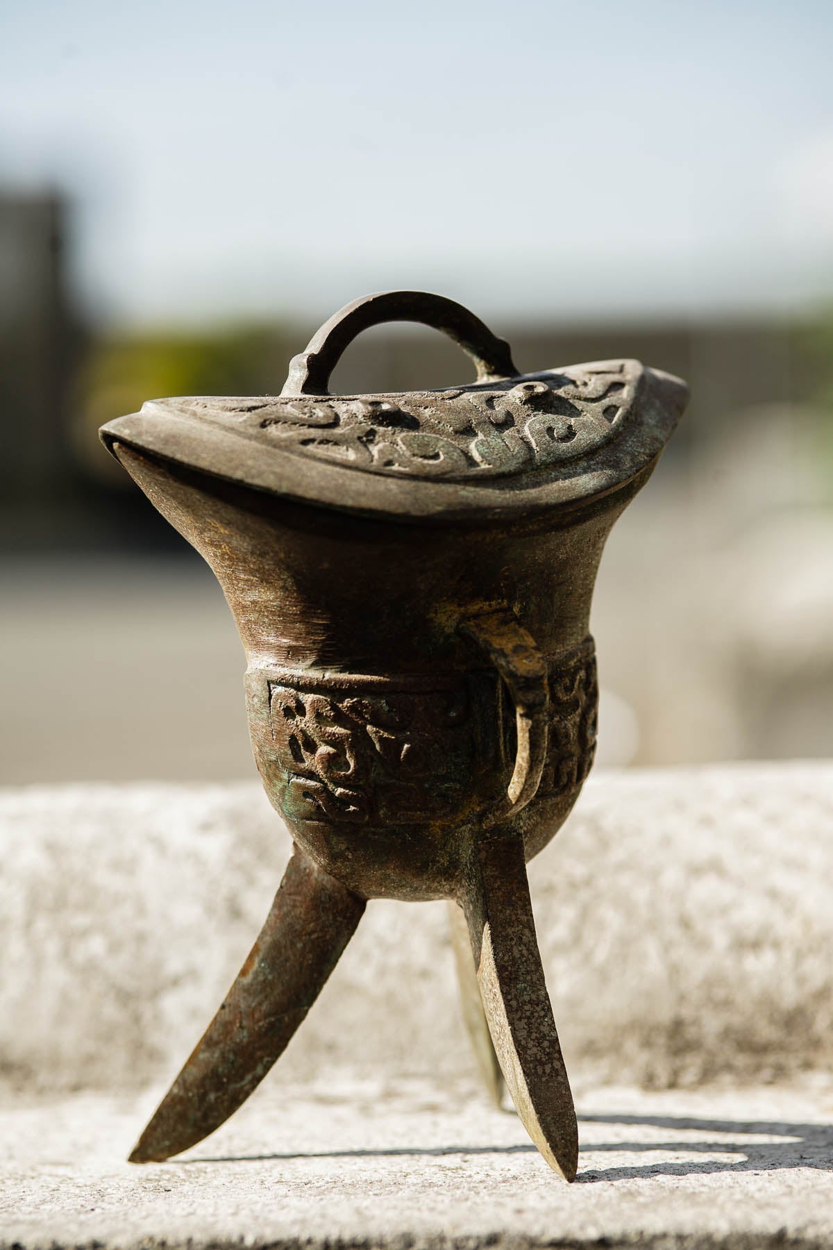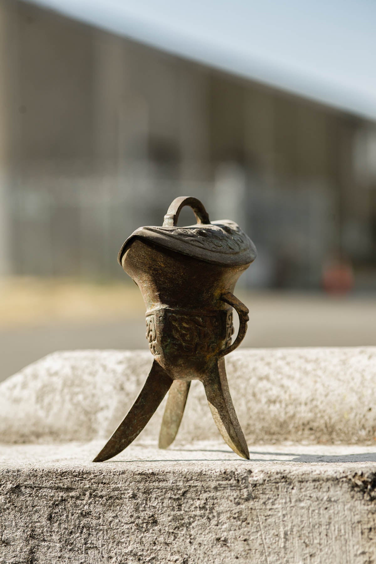 Sand-cast and hand-incised bronze wine warming vessel with a natural buried patina. The Jué is one of the most recognized ritual spouted wine vessels that dates back 4,000 years. This was inspired by a museum piece and re-imagined by Lucia Lawrence. Suitable for use as a decor item indoors or outdoors. These vessels were commissioned by the late legendary interior designer Lucia Lawrence, handmade in Hong Kong by a high-end specialist for the luxury brand Lawrence & Scott in Seattle. Each piece takes 7 months to create.