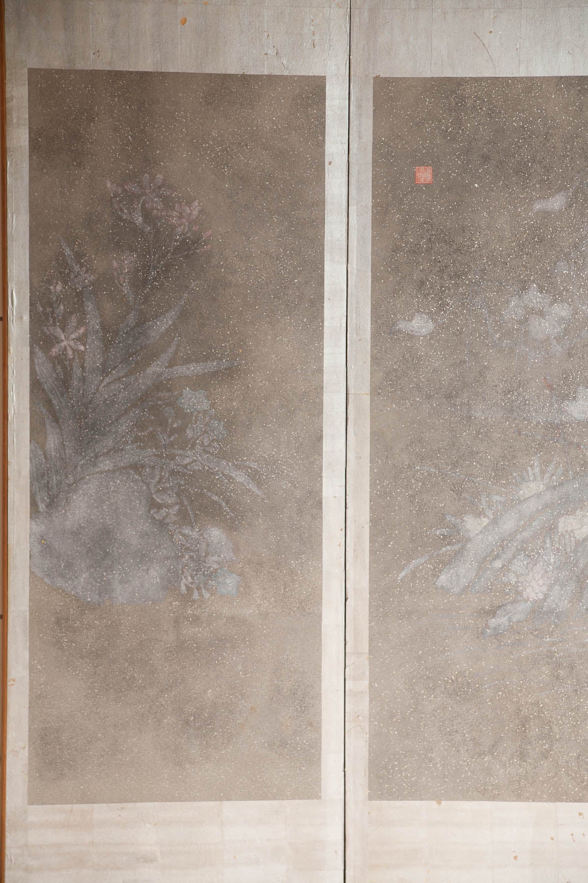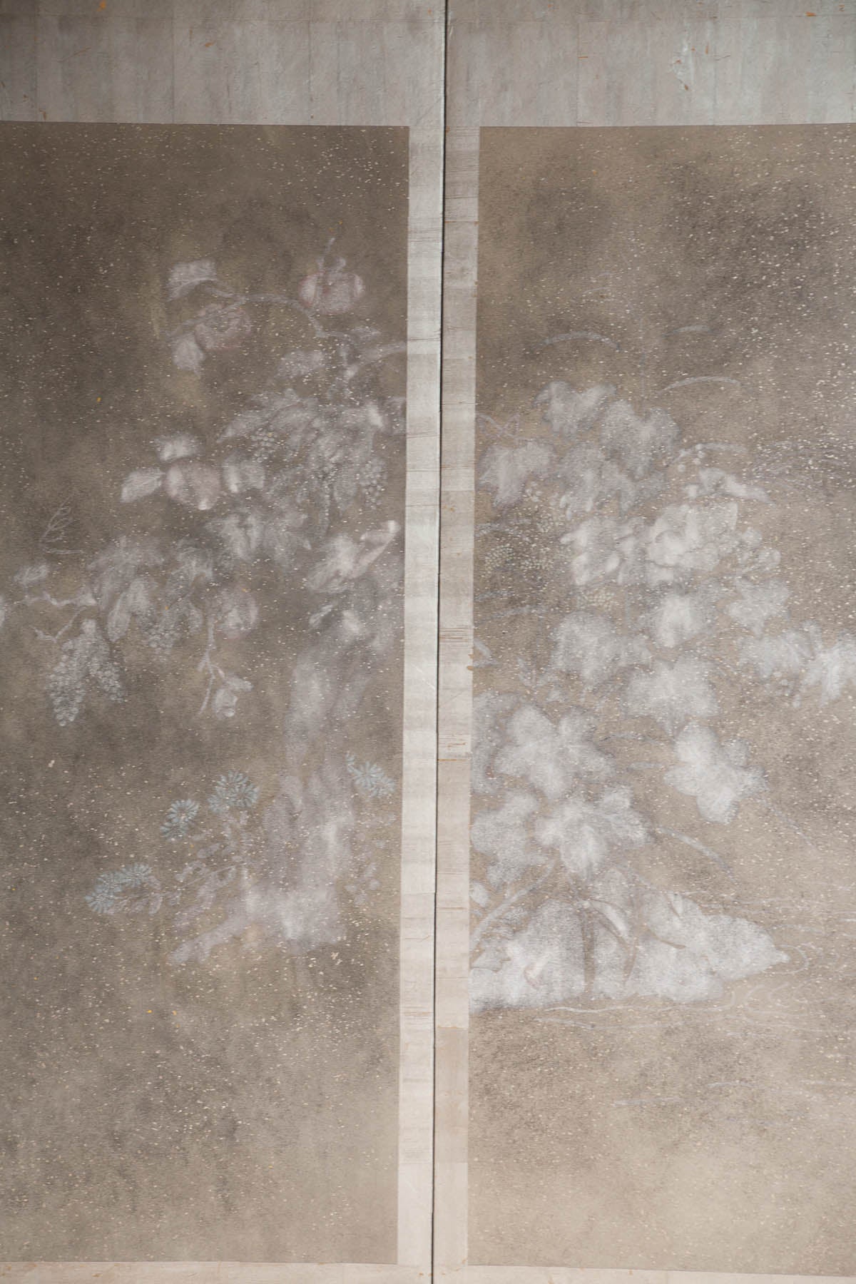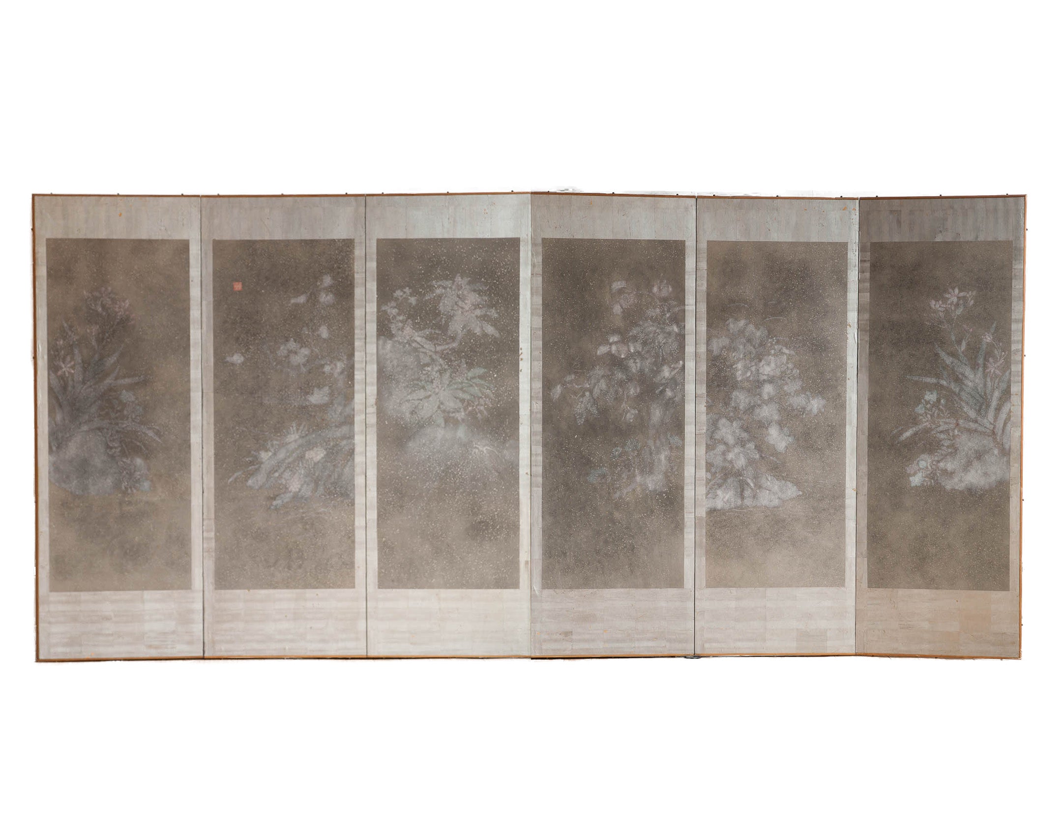 A stunning large scale 6-panel screen with korin flowers painted on paper on top of silver foil background. This screen is gentle, and brings quiet sophistication to a space.
