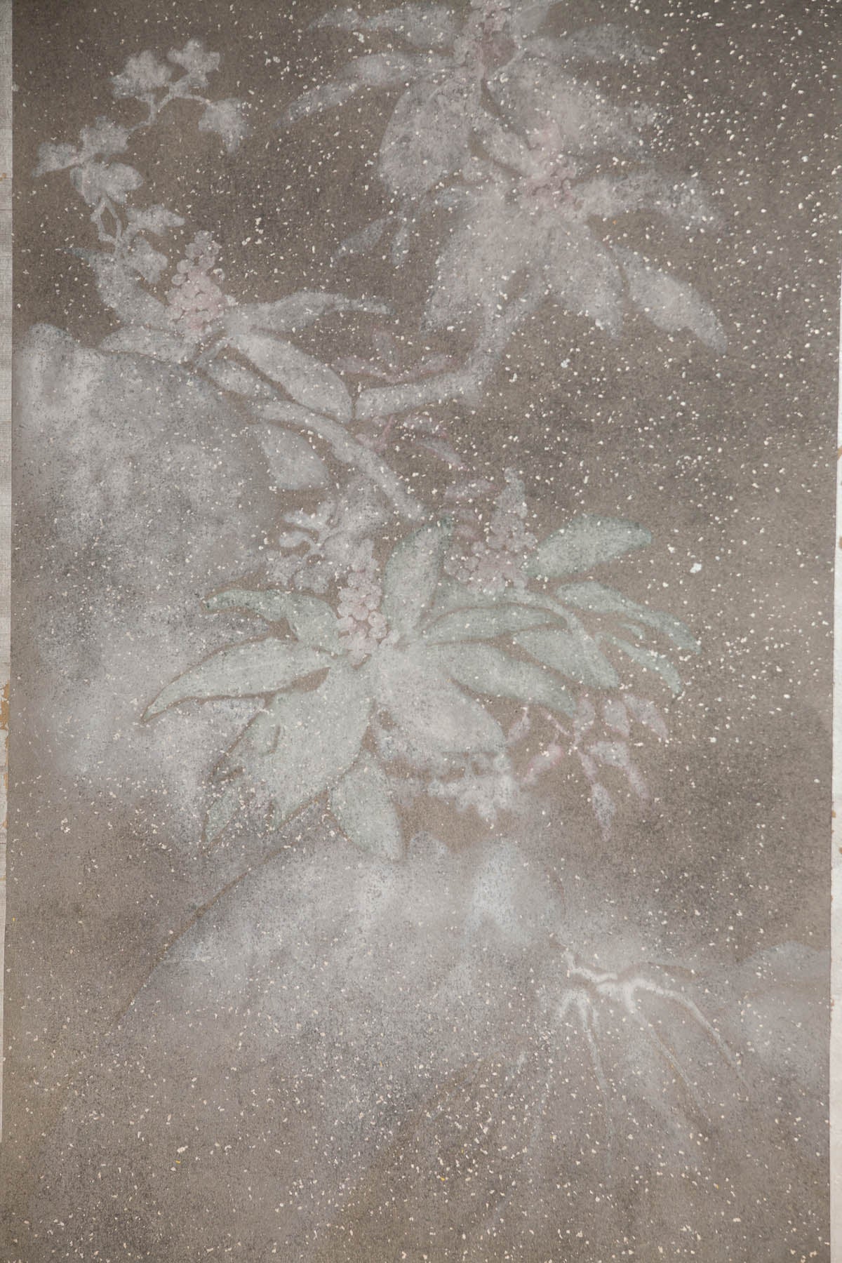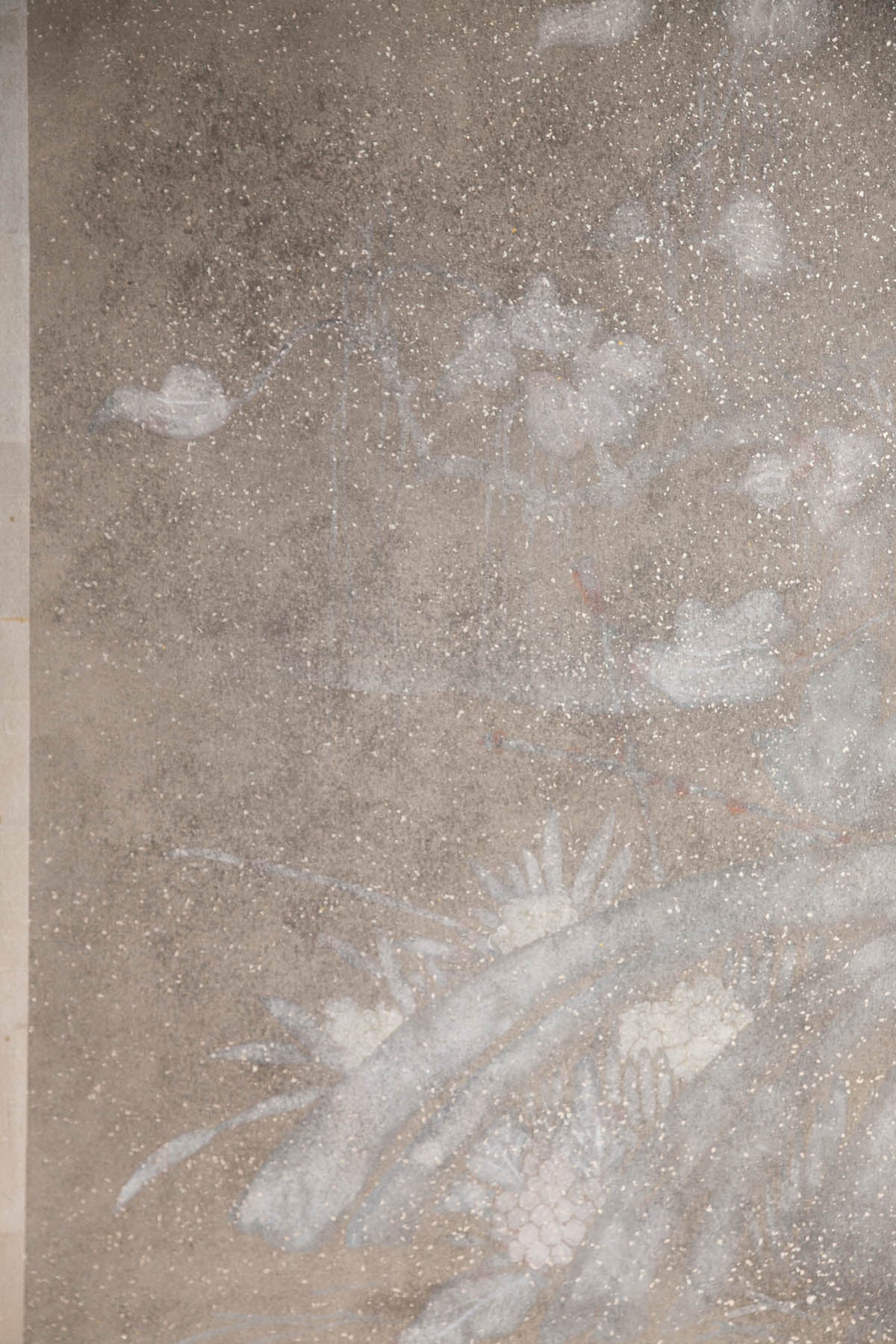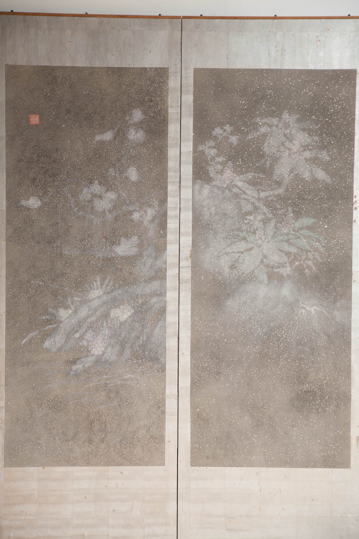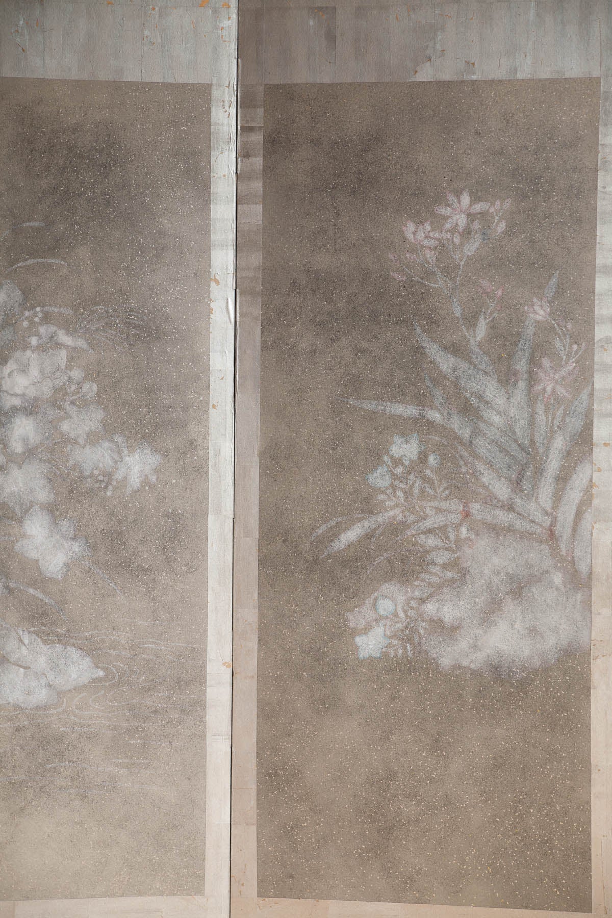 A stunning large scale 6-panel screen with korin flowers painted on paper on top of silver foil background. This screen is gentle, and brings quiet sophistication to a space.